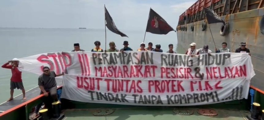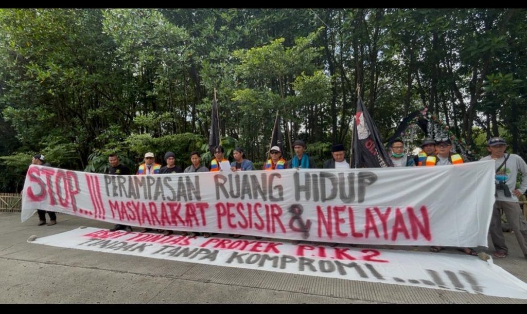 Dalam aksi tersebut, FKPN membentangkan spanduk tuntutan serta menyerukan pengusutan menyeluruh terhadap proyek PIK 2 yang dinilai berdampak pada lingkungan, akses laut, dan keberlangsungan hidup masyarakat pesisir.