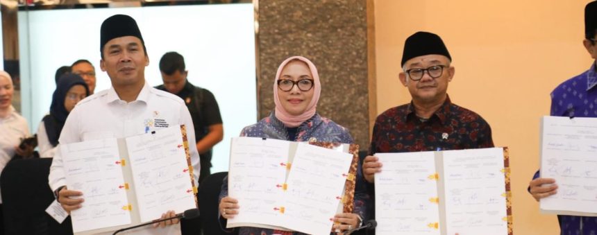 Menteri PPPA Arifah Fauzi bersama jajaran menteri menunjukkan naskah SKB Kesehatan Jiwa Anak di Jakarta, pada Kamis 06 Maret 2026. (Foto : kemenpppa.go.id)
