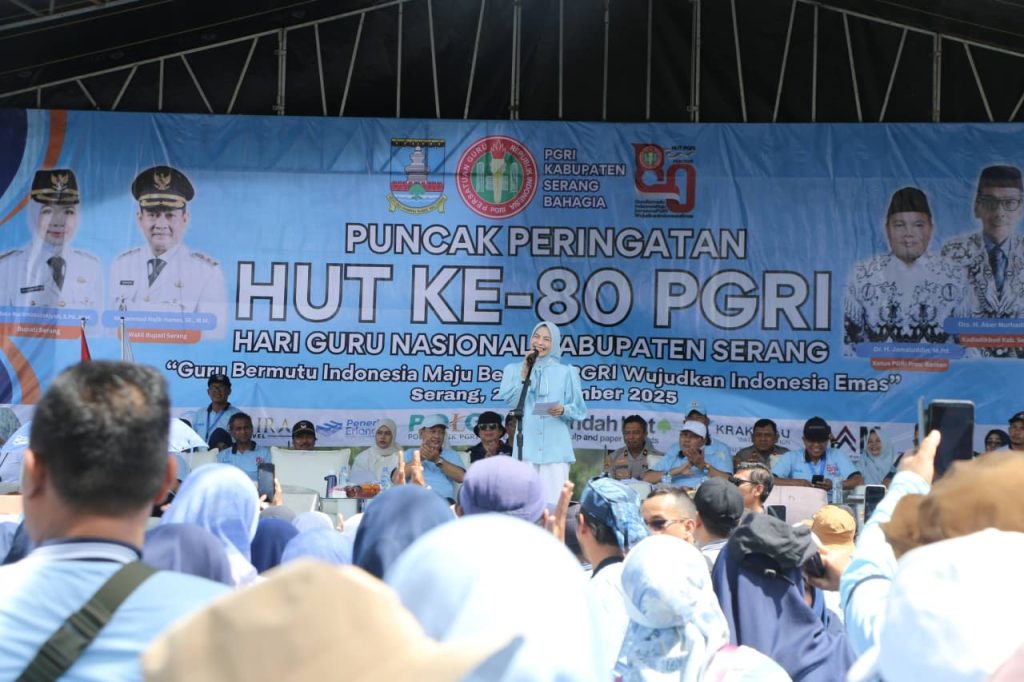 Damar Banten – Bupati Serang Ratu Rachmatuzakiyah menegaskan komitmennya untuk terus memperkuat kebijakan yang berpihak pada peningkatan kompetensi pendidik, pemerataan akses pendidikan, serta penyediaan fasilitas belajar yang layak. Hal itu disampaikan saat menghadiri Puncak HUT ke-80 PGRI dan Hari Guru Nasional (HGN) 2025 tingkat Kabupaten Serang di Pantai Florida, Cinangka, Selasa (25/11/2025).