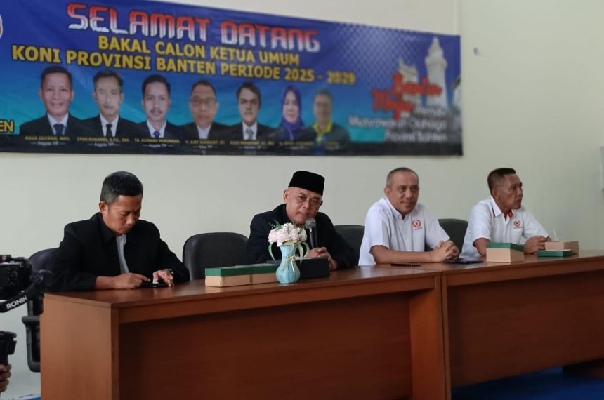 Damar Banten – Konferensi pers bakal calon Ketua Komite Olahraga Nasional Indonesia (KONI) Provinsi Banten digelar pada Jumat (19/9/2025). Agenda ini menjadi penanda dimulainya kontestasi pemilihan Ketua KONI yang baru. Sebanyak tujuh Tim Penjaringan dan Penyaringan (TPP) KONI Banten ditunjuk untuk memandu proses pemilihan agar berjalan transparan dan tertib. Mereka adalah Agus Irawan, MPD, Iyos Rosandi, S.Pd., MM, Tb. Kumaru Nurzaman, H. Ajat Sudrajat, SP, Rizki Ramadhan, SH., MH, Hj. Ratna Ambarwati, dan H. Dirman.