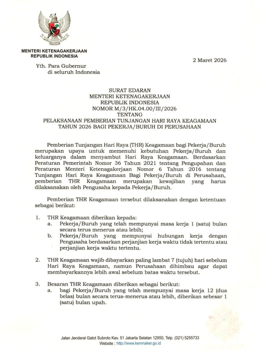 Reading: Menaker Terbitkan SE THR 2026, Pengusaha Wajib Bayar Penuh H-7 Lebaran