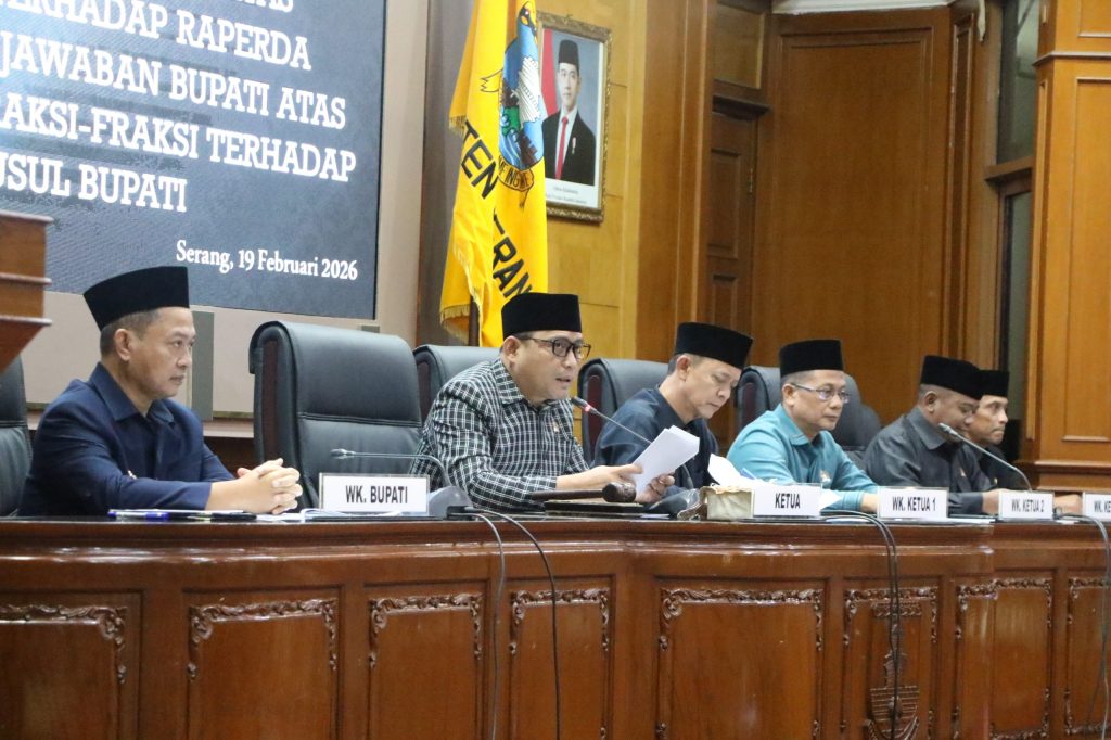 Hal tersebut disampaikan Wakil Bupati Serang Muhammad Najib Hamas dalam Rapat Paripurna DPRD Kabupaten Serang terkait jawaban fraksi-fraksi DPRD atas pendapat Bupati terhadap Raperda prakarsa DPRD serta jawaban Bupati atas pandangan umum fraksi terhadap Raperda usul Bupati, di gedung dewan, Kamis (19/2/2026).