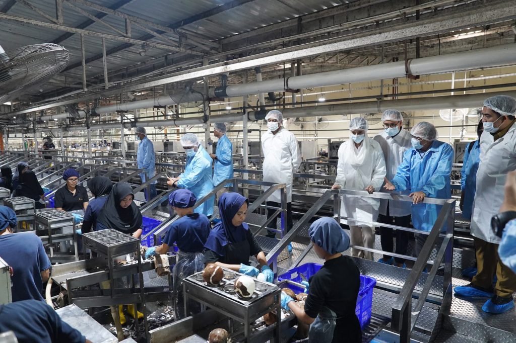 Di PT Bionesia Organic Foods, Wamendag meninjau proses pengolahan kelapa beserta produk turunannya seperti kelapa konsentrat, kelapa kering (desiccated coconut), air kelapa, hingga produk kelapa beku yang telah dipasarkan ke berbagai negara, termasuk Tiongkok.