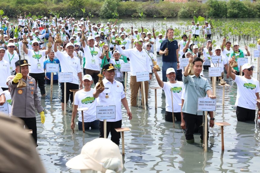 Damar Banten – Wakil Presiden Republik Indonesia Gibran Rakabuming Raka bersama Gubernur Banten Andra Soni melakukan penanaman mangrove di kawasan Ketapang Urban Aquaculture, Desa Ketapang, Kecamatan Mauk, Kabupaten Tangerang, Senin (27/10/2025). Kegiatan ini menjadi bagian dari upaya menjaga ekosistem pesisir sekaligus mitigasi dampak perubahan iklim.